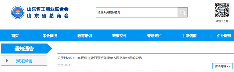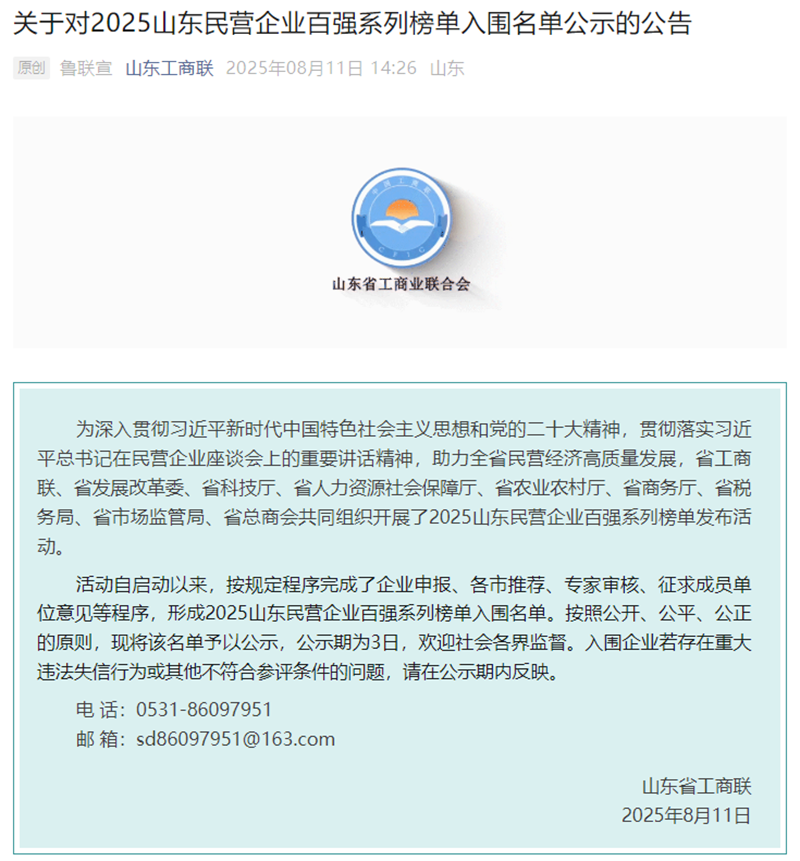 山东民营企业百强系列榜单是由省工商联、省发改委、省科技厅等9部门共同组织,分别评选“山东民营企业200强”、“山东民营企业创新100强”、“山东民营企业服务业100强”、“山东民营企业吸纳就业100强”,旨在表彰和鼓励在山东省内表现突出的民营企业,助力全省民营经济高质量发展。