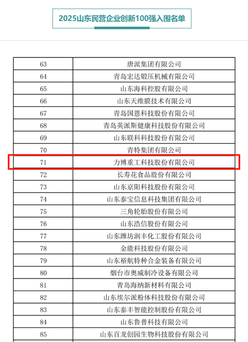 近日,2025山东民营企业百强系列榜单入围名单在山东省工商业联合会官网公示完成,力博重工科技股份有限公司成功登上“2025山东民营企业创新100强”榜单,这是我公司自2021年以来连续第5年荣获该项荣誉。